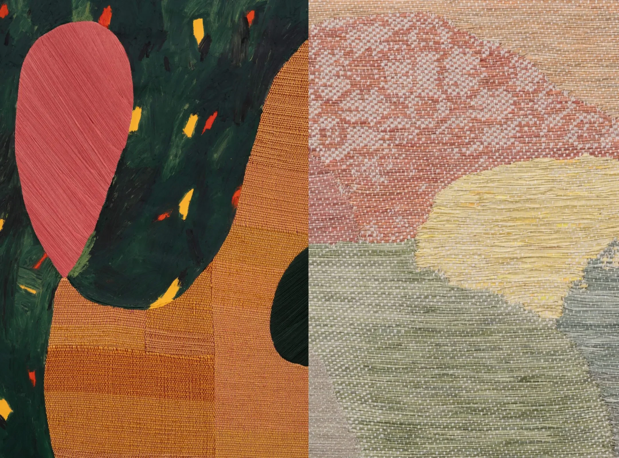 ‘Christy Matson and Amanda Valdez both live with the Pacific Northwest inside them; their motherlands. Exhibiting together for Milk Tide, their woven and mixed media pictures of rounded mounds and slopes and arches, provide both the landscape (Matson) and portrait (Valdez) orientation of landscapes by feel. There are no referential images that one can point to and say: “Mt. Rainier!,” rather one gets the impression of place and how it becomes re-rendered in the imagination over time. The act of remembering always brings forth and changes the recollection before being stored back in the catalog of memories, melting them down over time into wisps and veils that become less and less like pictures. Matson and Valdez show us the sensation of those memories; something only art is capable of.’